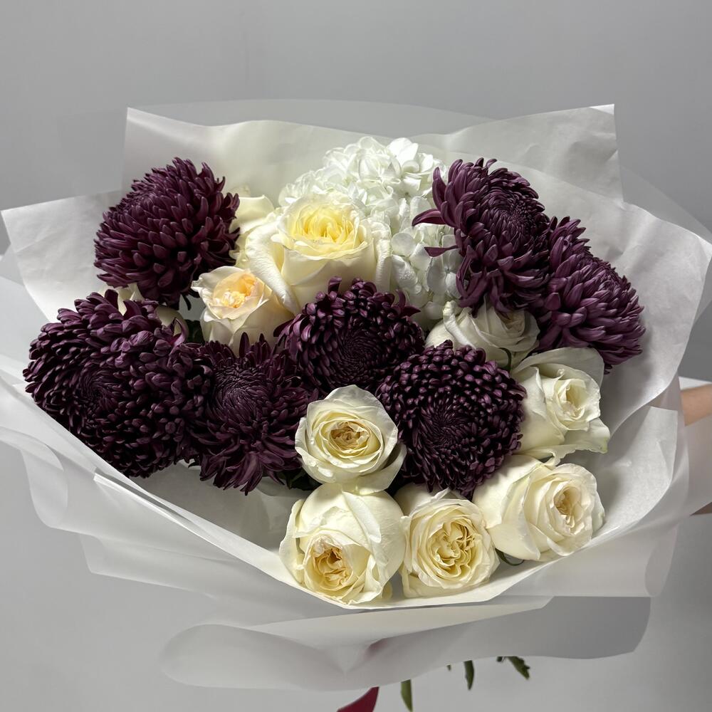 Гортензия - 1 шт. Роза Эквадор - 9 шт. Лента атласная - 1 шт. Упаковка дизайнерская - 3 шт. бигуди хризантема - 7 шт.