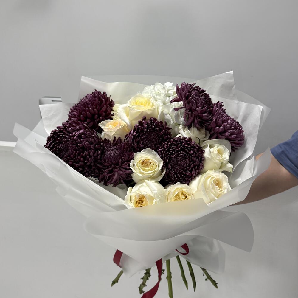 Букет, где нежность живёт в каждом лепестке. Белая роза — как дыхание утреннего света, гортензия — облако из снов, а изящные бигуди придают игре форм лёгкость и характер. Тонкое сочетание чистоты, утончённости и нежной дерзости.