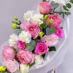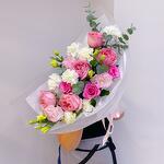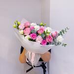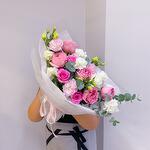 Эвкалипт - 2 шт. Эустома - 3 шт. голландские розы - 3 шт. пионовидные розы - 5 шт. диантусы - 5 шт.