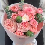 Эвкалипт - 1 шт. Роза пионовидная - 3 шт. Ранункулюс - 1 шт. джульетта - 3 шт. аква бумага - 2 шт.