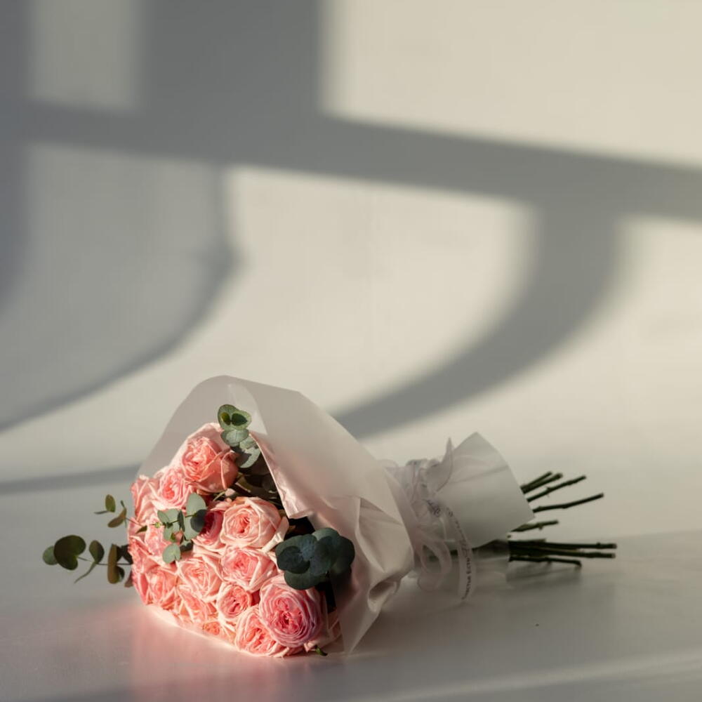 Изящное сочетание 17 ароматных роз сорта Pink Ohara и листьев Эвкалипта Baby Blue делают этот монобукет настоящим украшением любого интерьера. Яркие, нежно-розовые соцветия розы завораживают своей красотой, а свежесть и приятный аромат эвкалипта погружает в атмосферу естественной свежести. Этот букет станет изысканным подарком для любимых и близких, подойдет на любой праздник или просто для создания уютной атмосферы дома.