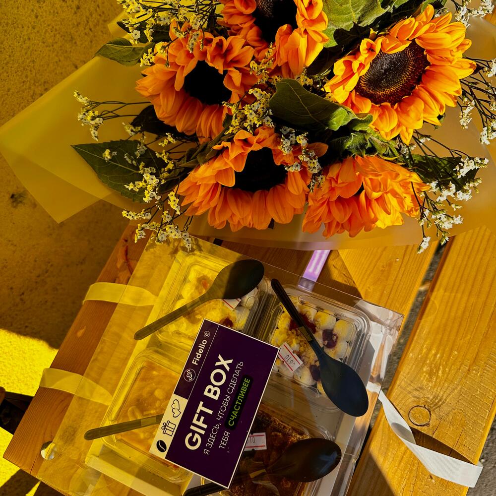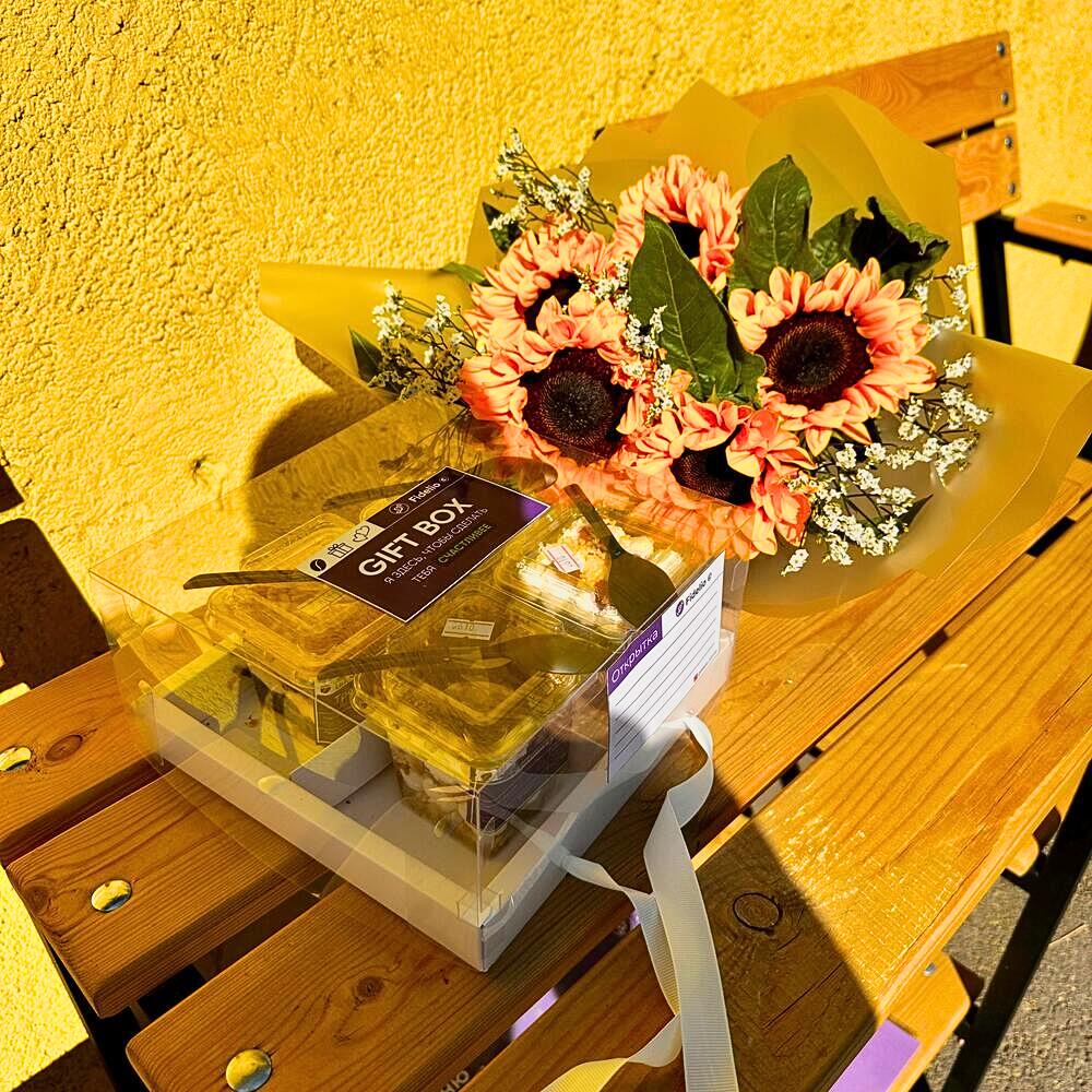 подсолнухи крупные - 5 шт. декоративная зелень эвкалипт - 5 шт. трайфл сникерс - 1 шт. трайфл ягодный - 2 шт. трайфл тирамису - 1 шт.