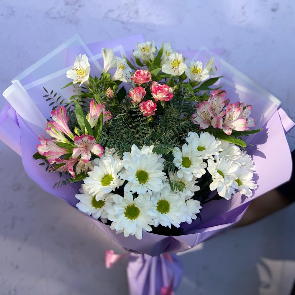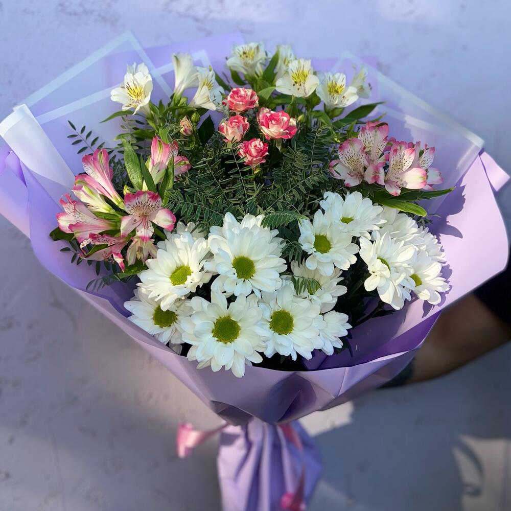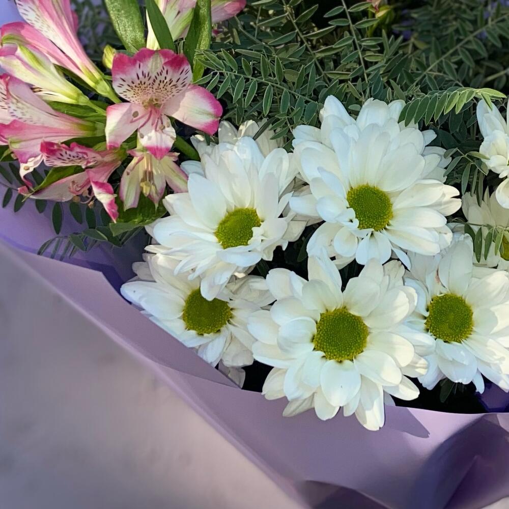 Альстромерия - 5 шт. Роза кустовая - 1 шт. Хризантема кустовая - 2 шт.