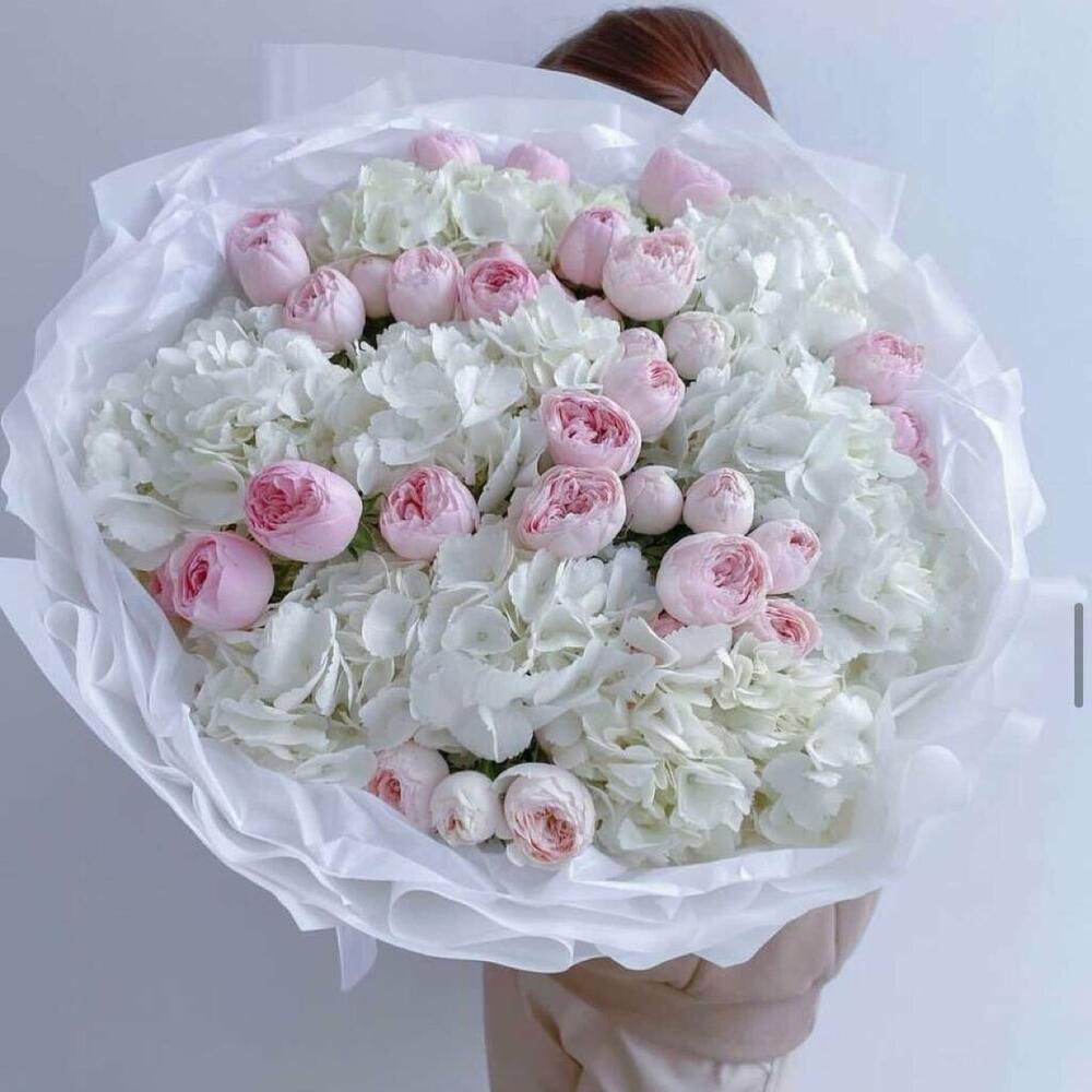 Роза пионовидная - 9 шт. Дизайнерская упаковка - 1 шт. гортензия гидрангея - 15 шт.