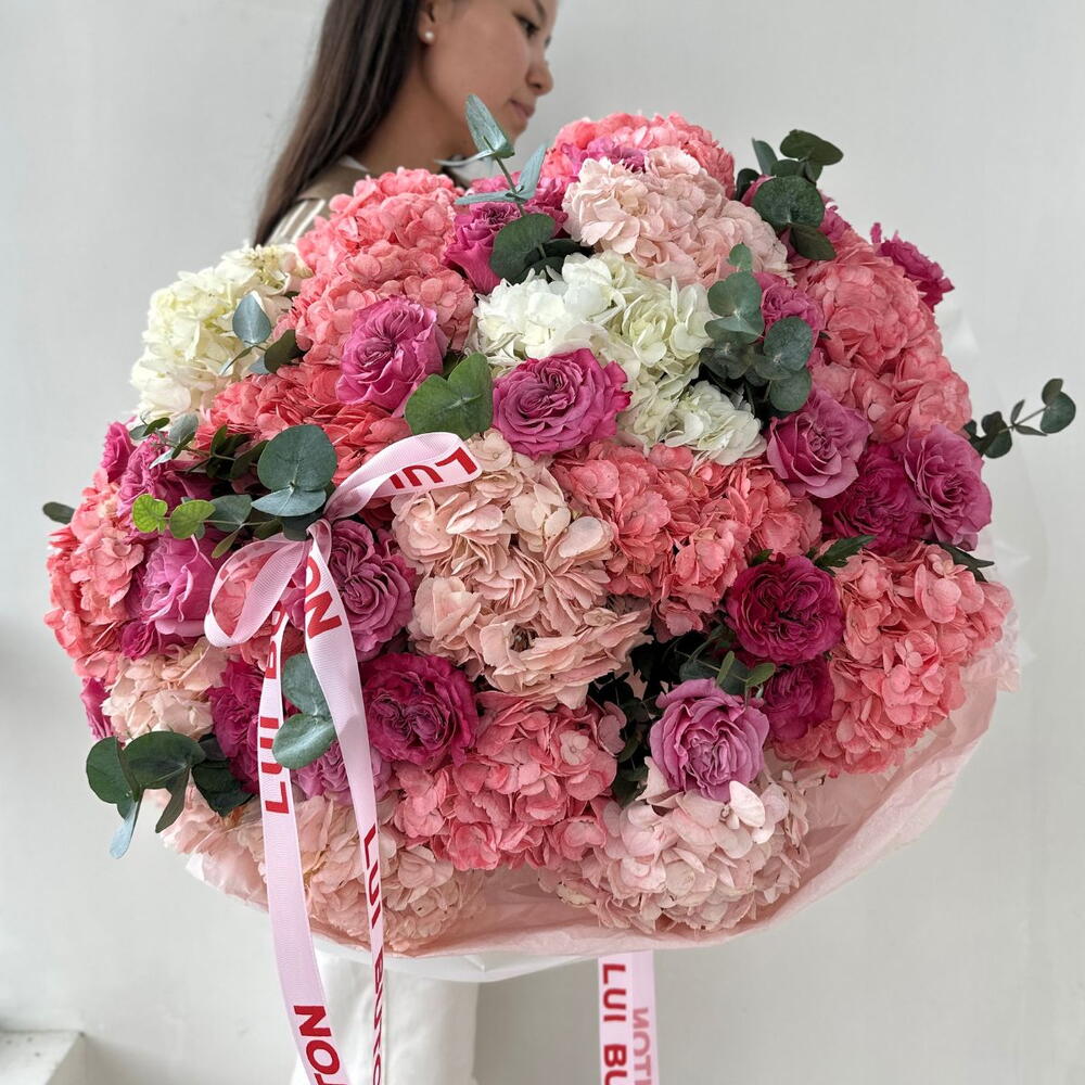 Эвкалипт - 4 шт. гортензии - 15 шт. пионовидные розы - 15 шт.