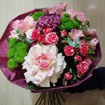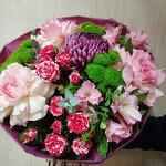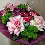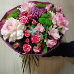 Хризантема зеленая кустовая - 2 шт. зелень писташ - 3 шт. роза эсперанса развернутая - 3 шт. хризантема кудрявая бордо - 1 шт. альстромерия розовая - 3 шт.