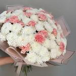 Лёгкий и воздушный букет, в котором белоснежные хризантемы гармонично сочетаются с пудровыми гвоздиками. Элегантная упаковка в мягких оттенках подчёркивает утончённость композиции. Этот букет идеально подойдёт для поздравления, благодарности или просто для того, чтобы порадовать близкого человека.