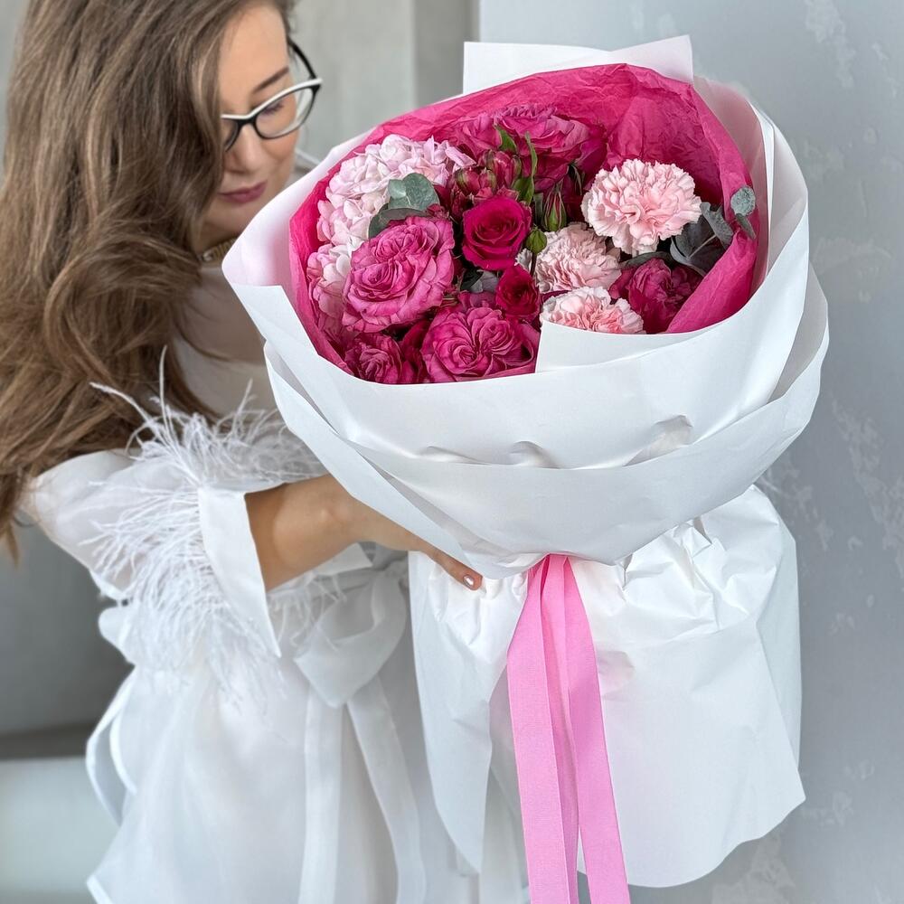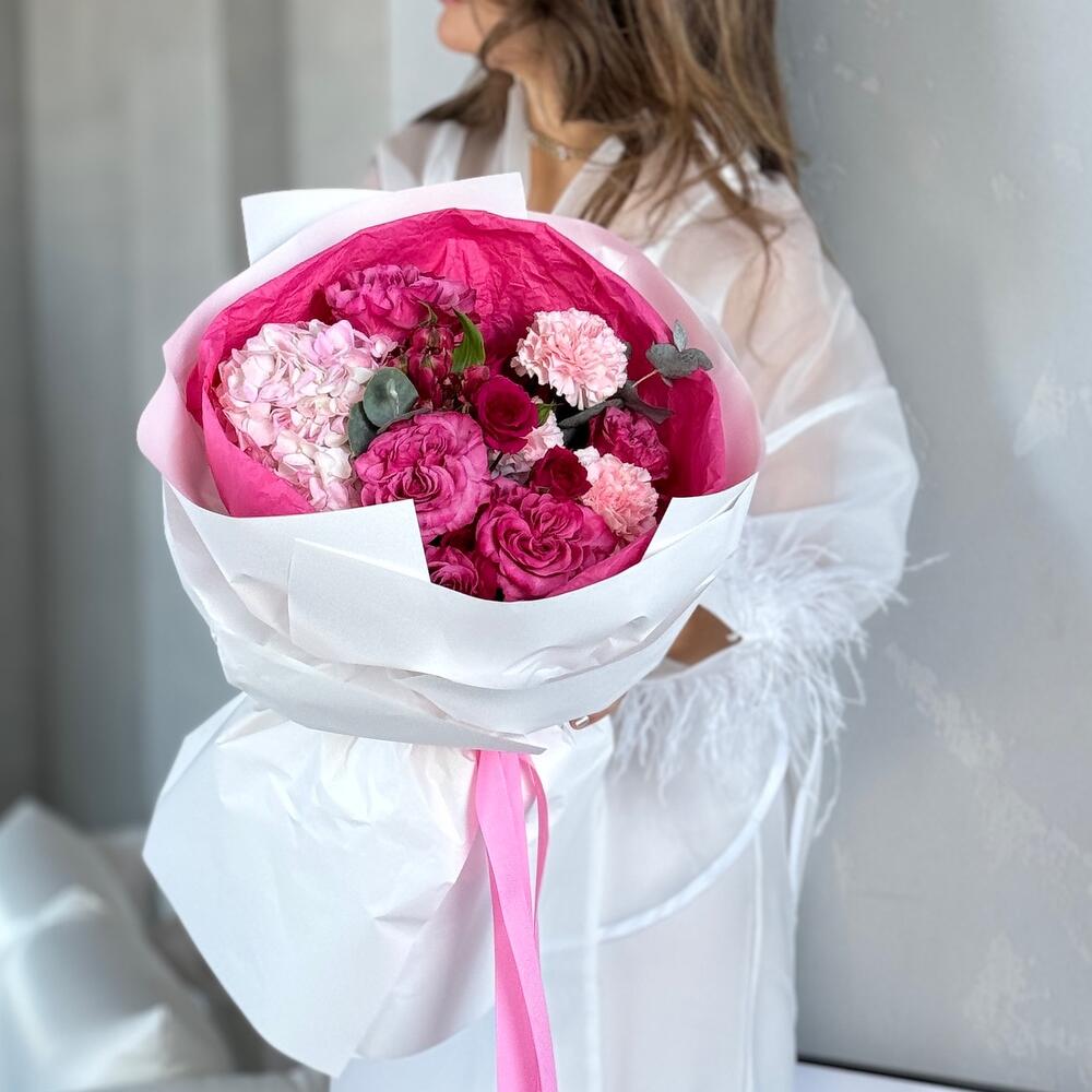 Альстромерия - 1 шт. Гортензия - 1 шт. Роза кустовая - 2 шт. Диантус - 3 шт. Роза пионовидная - 5 шт. Коробка - 1 шт. Открытка - 1 шт. Упаковка дизайнерская - 1 шт. Эвкалипт Цинерея - 2 шт.