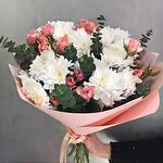 Лёгкий и воздушный букет, в котором сочетаются белоснежные хризантемы, нежные розовые кустовые розы и ароматный эвкалипт. Белые цветы символизируют чистоту и гармонию, а розовые оттенки добавляют романтики и тепла. Этот элегантный ансамбль станет идеальным подарком для любого случая — будь то праздник, знак благодарности или просто способ порадовать близкого человека.