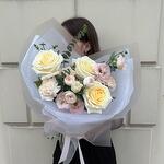 Лизиантус - 2 шт. Эвкалипт - 1 шт. Диантус - 3 шт. Кустовая пионовидная роза - 1 шт. розы candlelight - 3 шт.