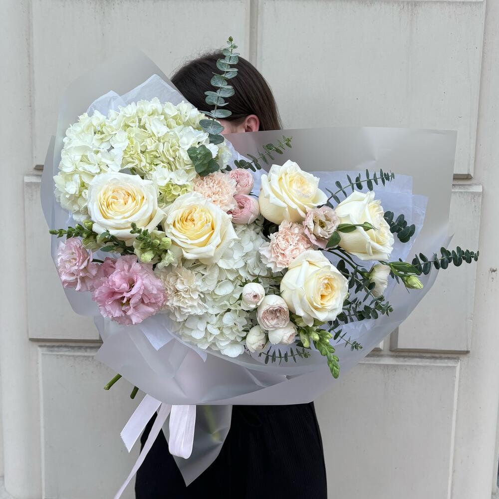 Лизиантус - 2 шт. Эвкалипт - 3 шт. Диантус - 3 шт. Кустовая пионовидная роза - 2 шт. Гортензия белая - 2 шт. розы candlelight - 5 шт.