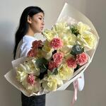 Букет из французских роз, диантусов и эвкалипт. Естественная красота цветов в современном оформлении