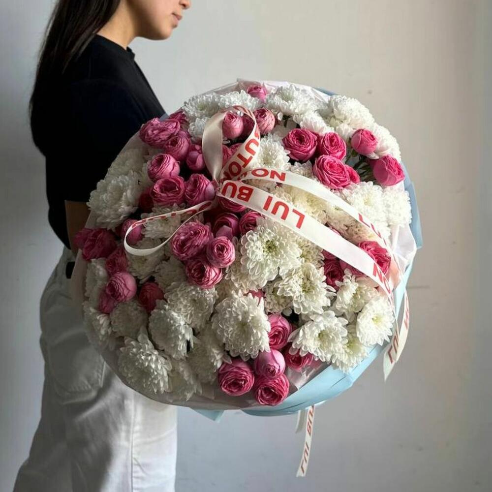 Букет из кустовых роз и хризантем. Этот букет создан, чтобы вызывать восторг. Он выглядит дорого, ощущается особенным и запоминается надолго