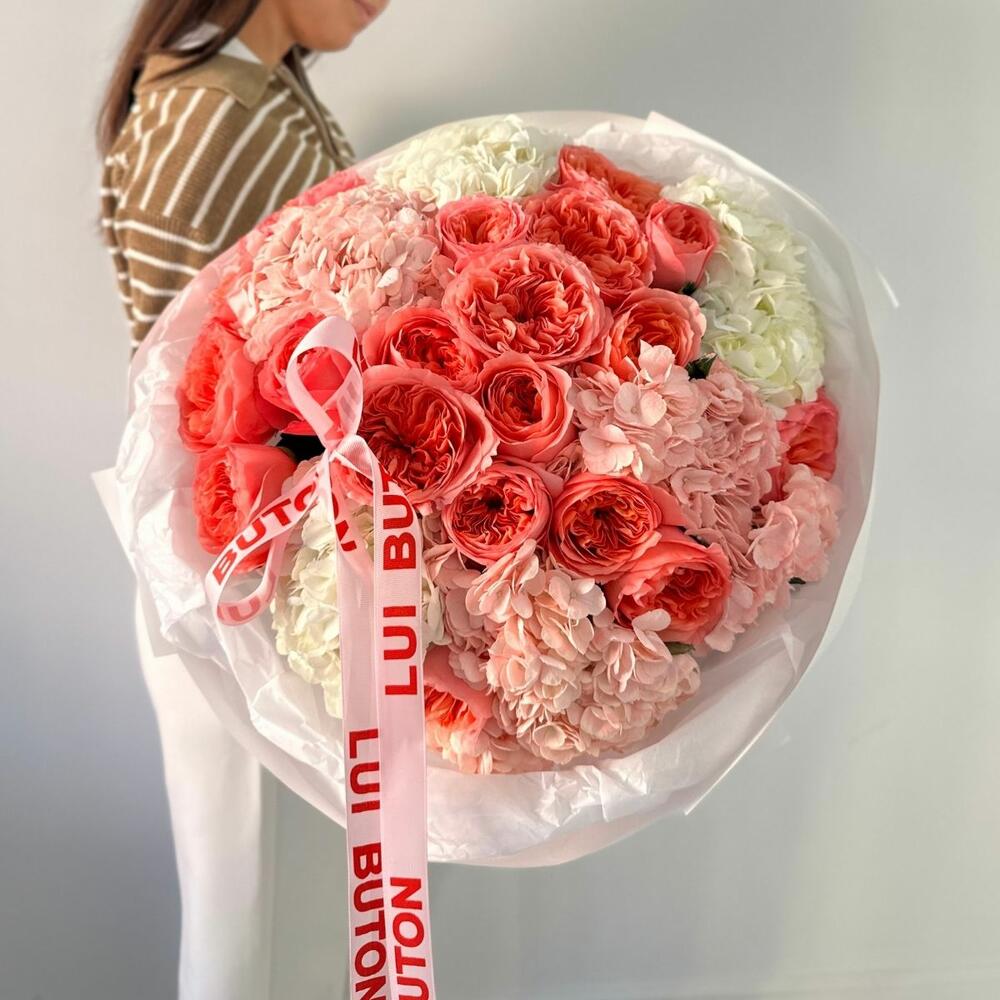гортензии - 6 шт. пионовидные розы - 19 шт.