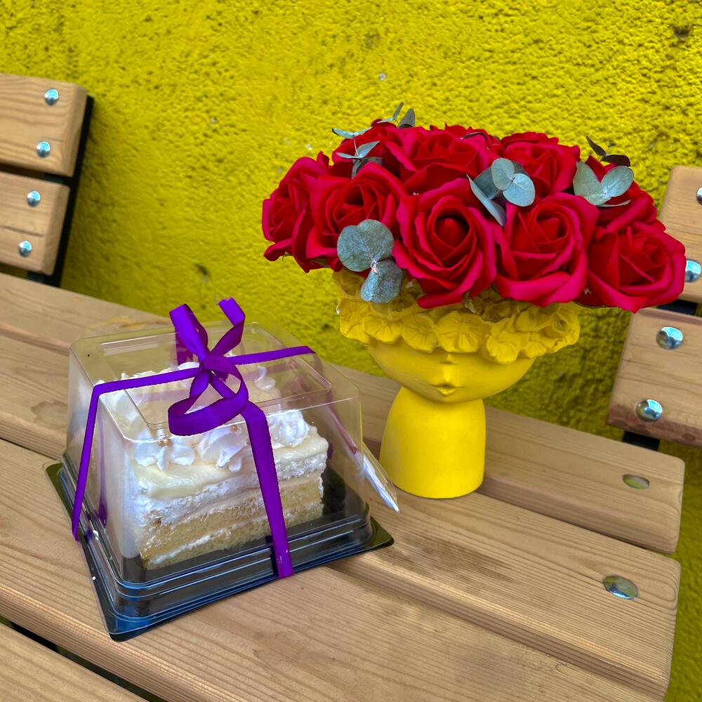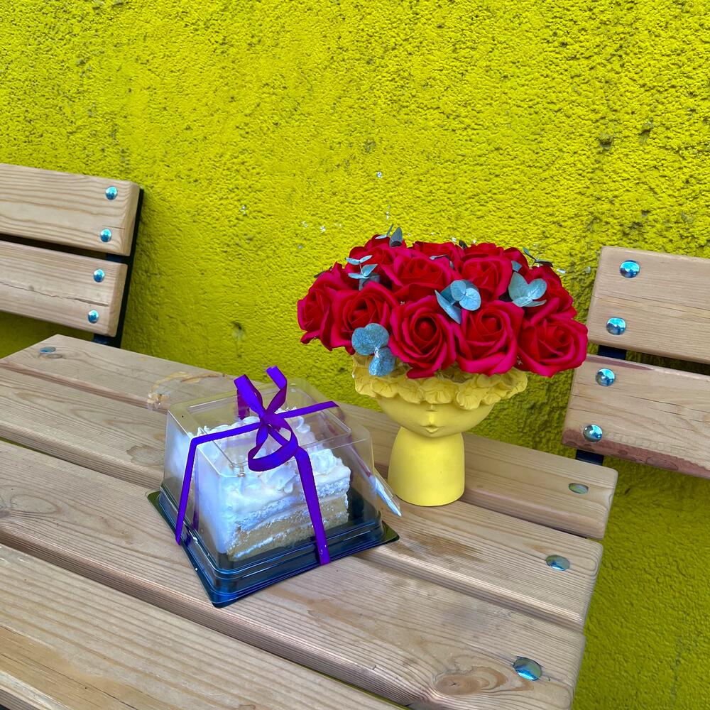 Букет роз в хэнд-мейд вазе и бенто тортик торт