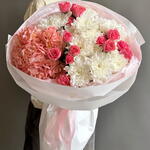 Этот авторский букет идеально уловил очарование и гармонию природы. В нем гортензия гордо возвышается, украшая букет своей щедростью и благородством, в то время как тройственность кустовых роз добавляет композиции изысканности и нежности. Хризантемы сыграли в этом букете роль акцента, добавив еще больше жизни и красочности. Составленный с большим вкусом и любовью к своему делу, этот букет станет прекрасным подарком для любого случая.