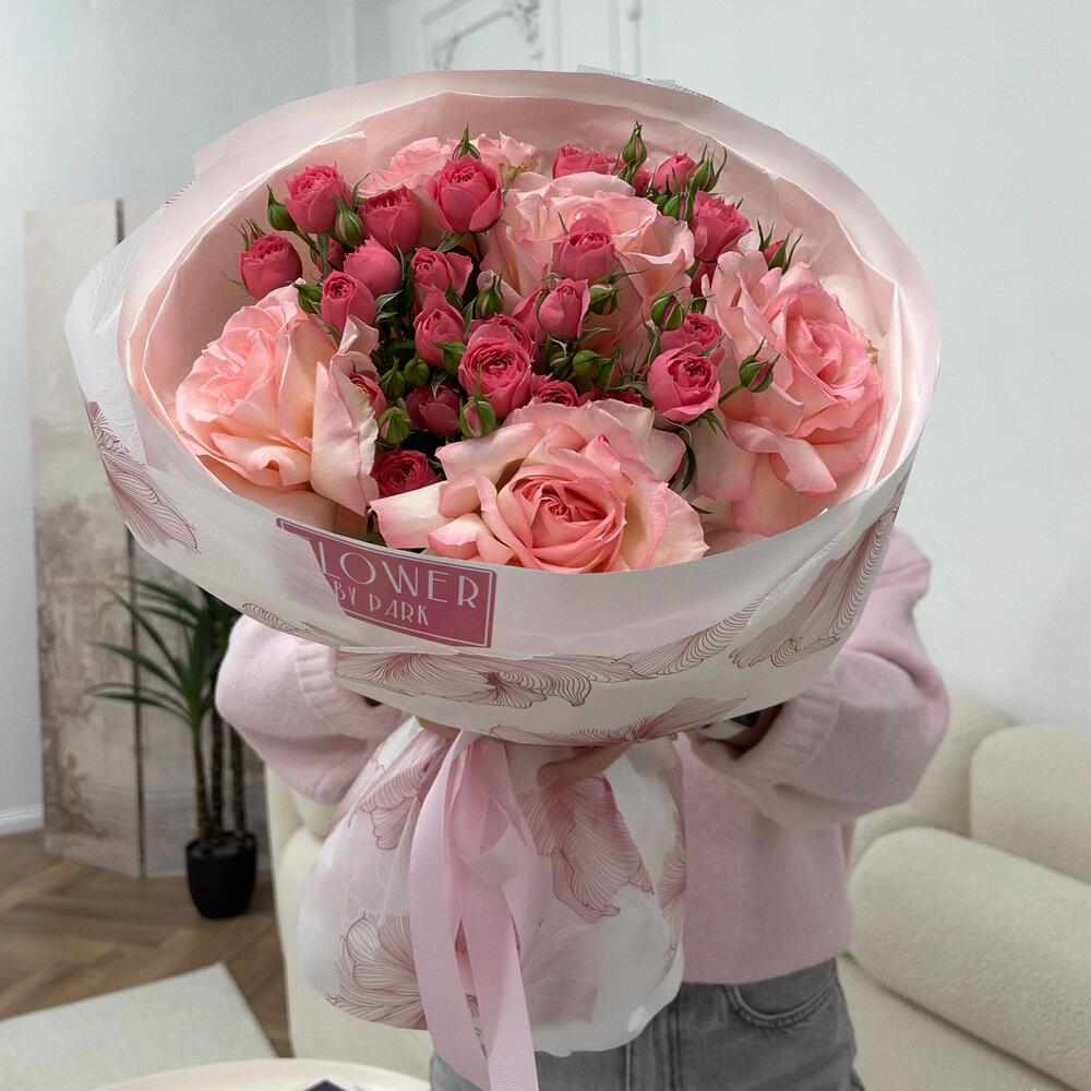 Нежный, как первое утро весны — букет в мягких розовых тонах с крупными розами и кустовыми розочками. Он излучает тепло, лёгкость и романтику, создавая атмосферу заботы и любви. Идеальный подарок для выражения самых тёплых чувств — маме, подруге, любимой или себе, просто чтобы порадовать душу 🌸