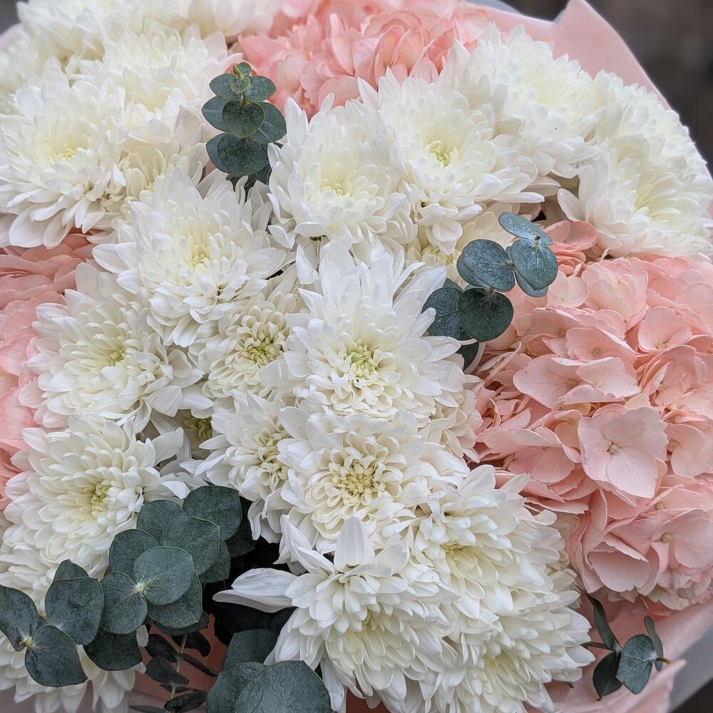 Гортензия - 3 шт. Хризантема кустовая - 9 шт. Эвкалипт - 3 шт.