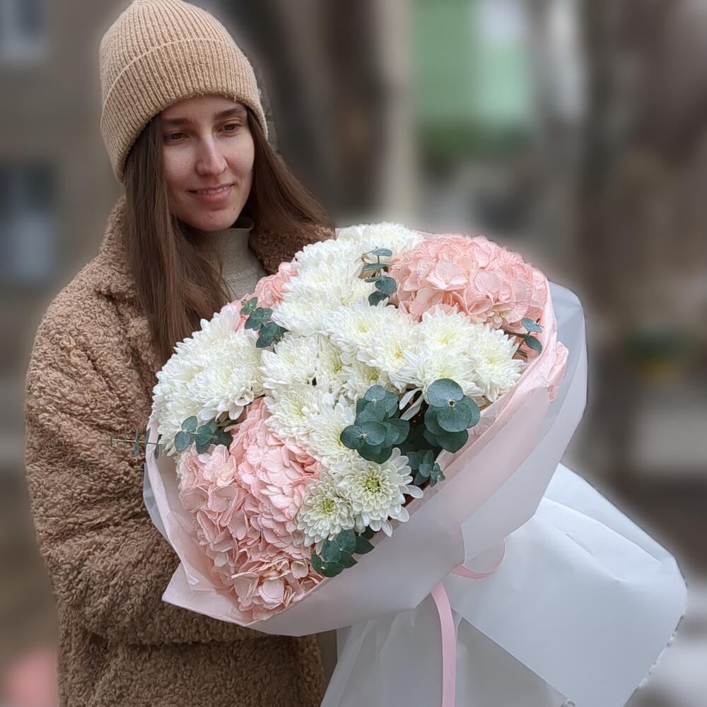 Букет Розовый Инь-Янь с гортензиями и хризантемой