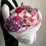 Гиперикум - 1 шт. Гортензия - 1 шт. Эвкалипт - 1 шт. Хризантема - 1 шт. Диантус - 2 шт. орхидея - 1 шт. Одноголовая хризантема - 1 шт. пионовидные розы - 3 шт.