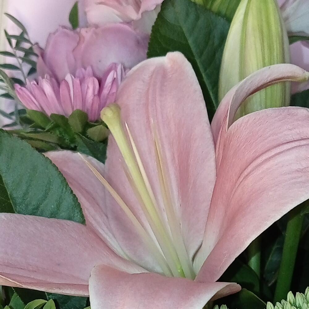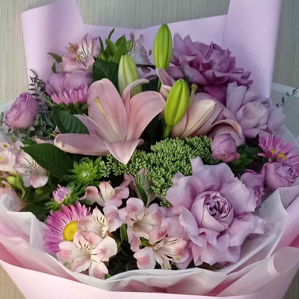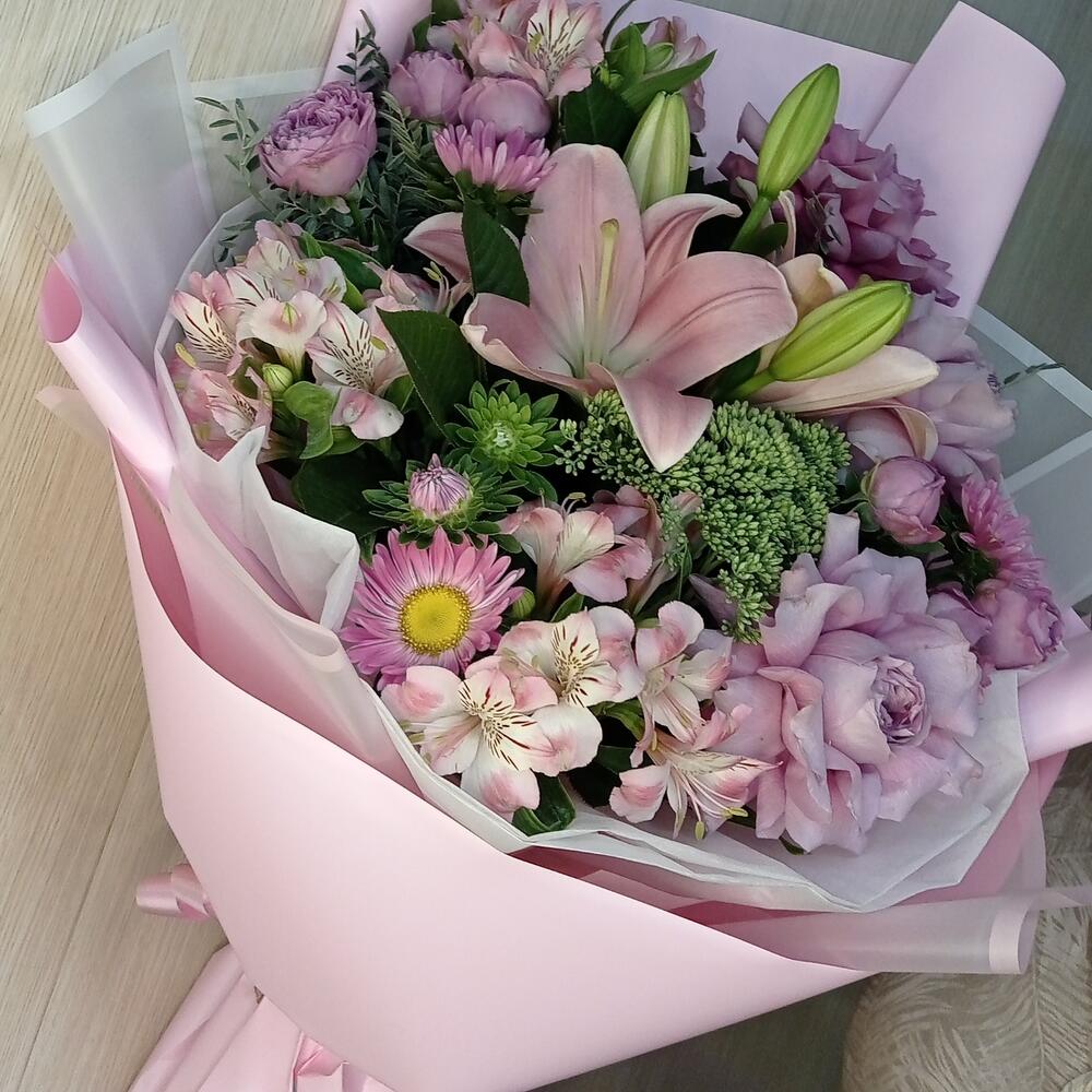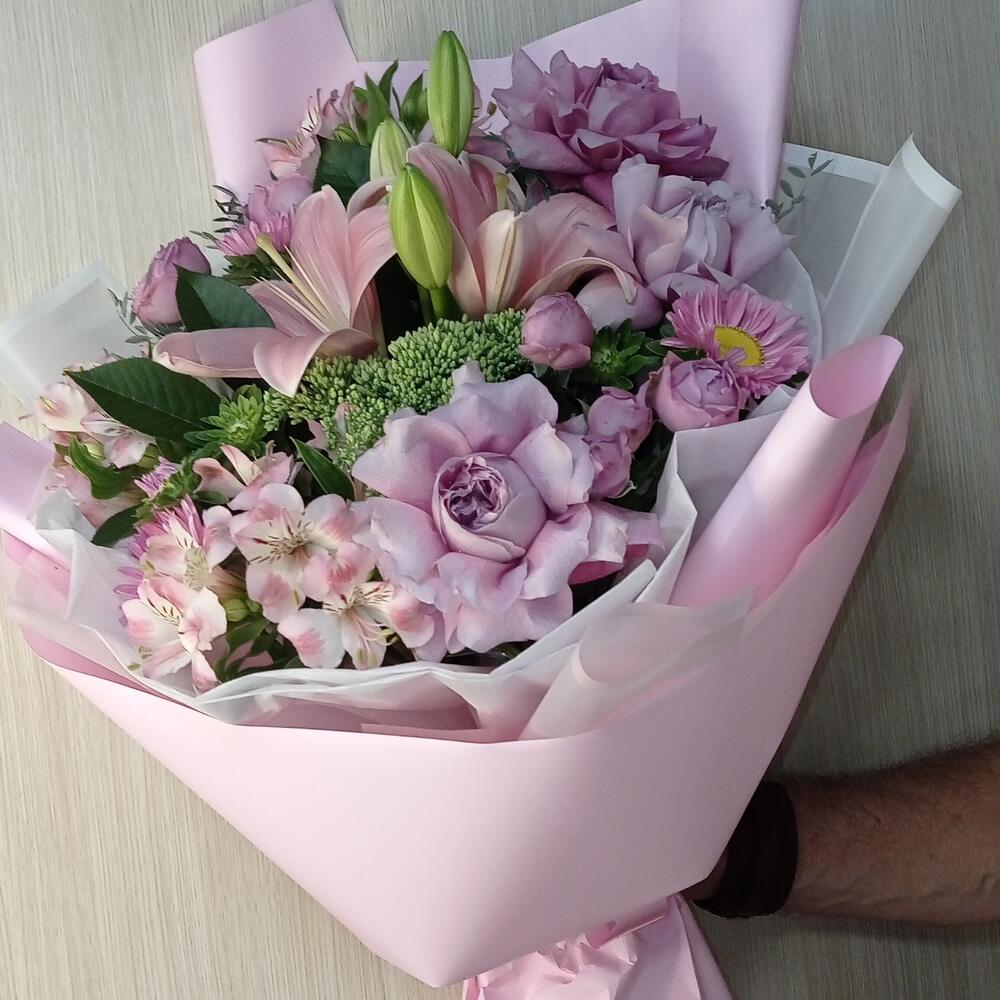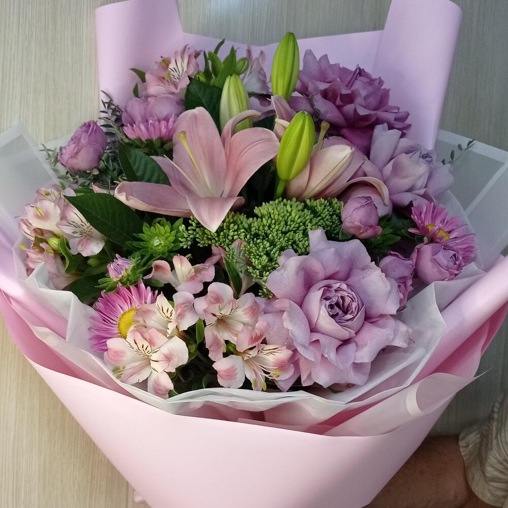 Альстромерия - 3 шт. Астра - 2 шт. Роза розовая - 3 шт. Роза кустовая розовая - 2 шт. Лилия Розовая - 1 шт.