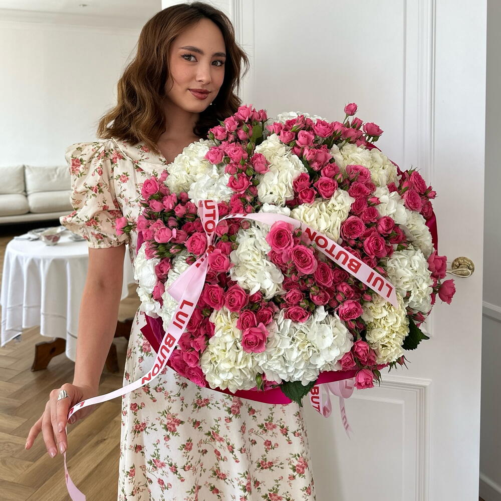 Восхитительный авторский букет, состоящий из 13 пышных гортензий и 15 нежных кустовых роз, создаст неповторимую атмосферу праздника и уют. Этот букет станет изысканным подарком для любого случая, а деликатная цветовая гамма и изящность композиции придадут вашему подарку особый шарм и элегантность. Почувствуйте великолепие натуральных цветов, ведь каждый лепесток воссоздан с любовью и заботой о красоте.