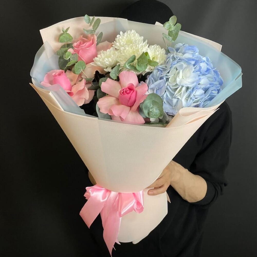 Гортензия - 1 шт. Хризантема кустовая - 1 шт. Роза - 3 шт. Эвкалипт Цинерея - 2 шт.