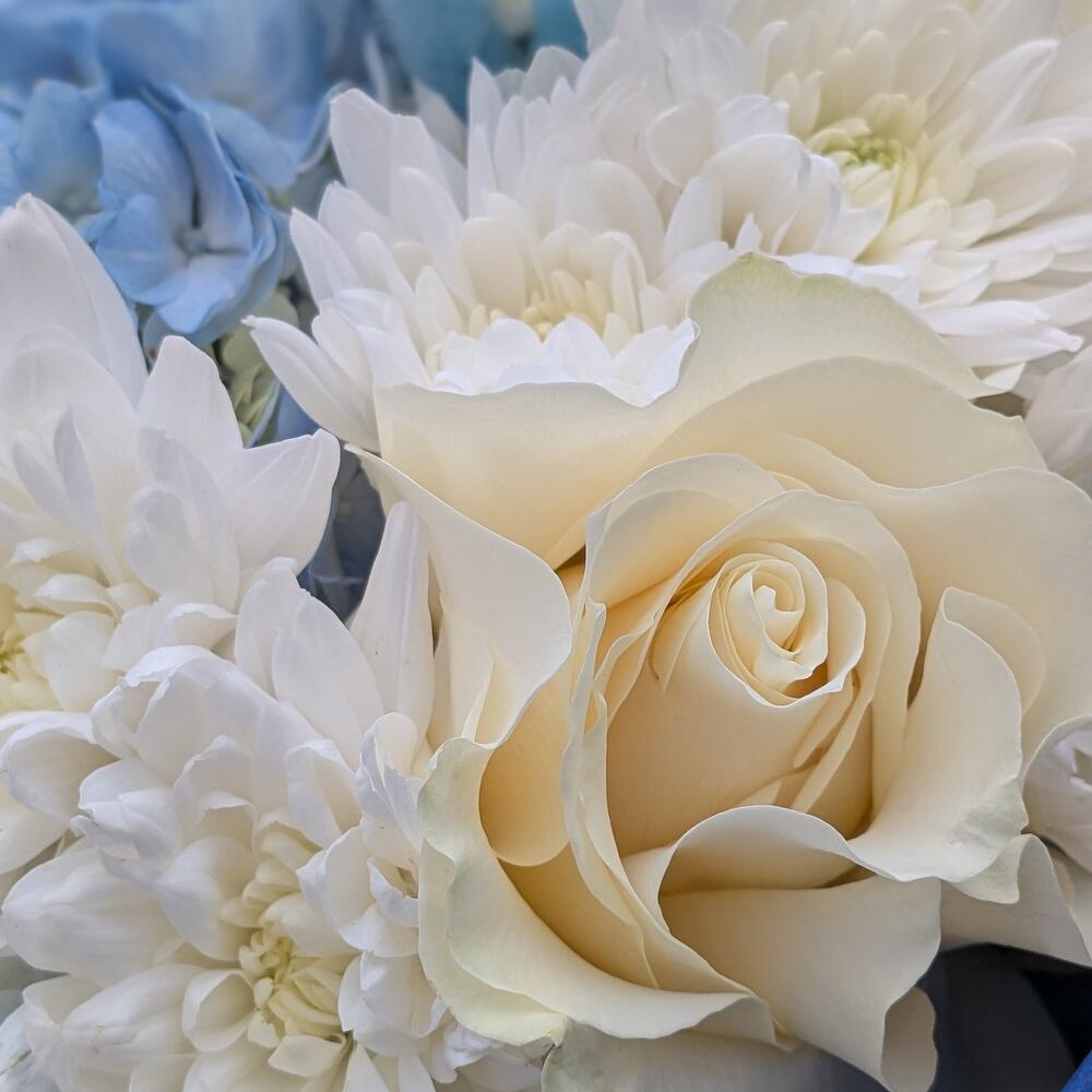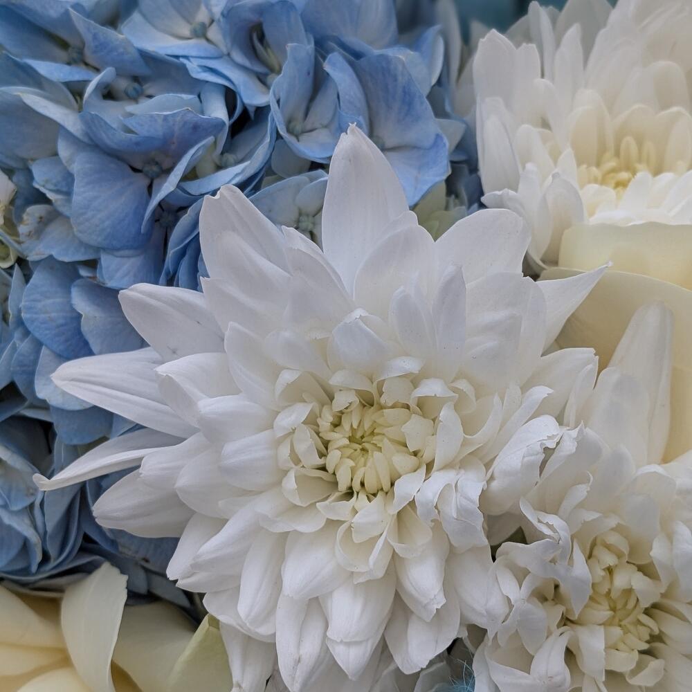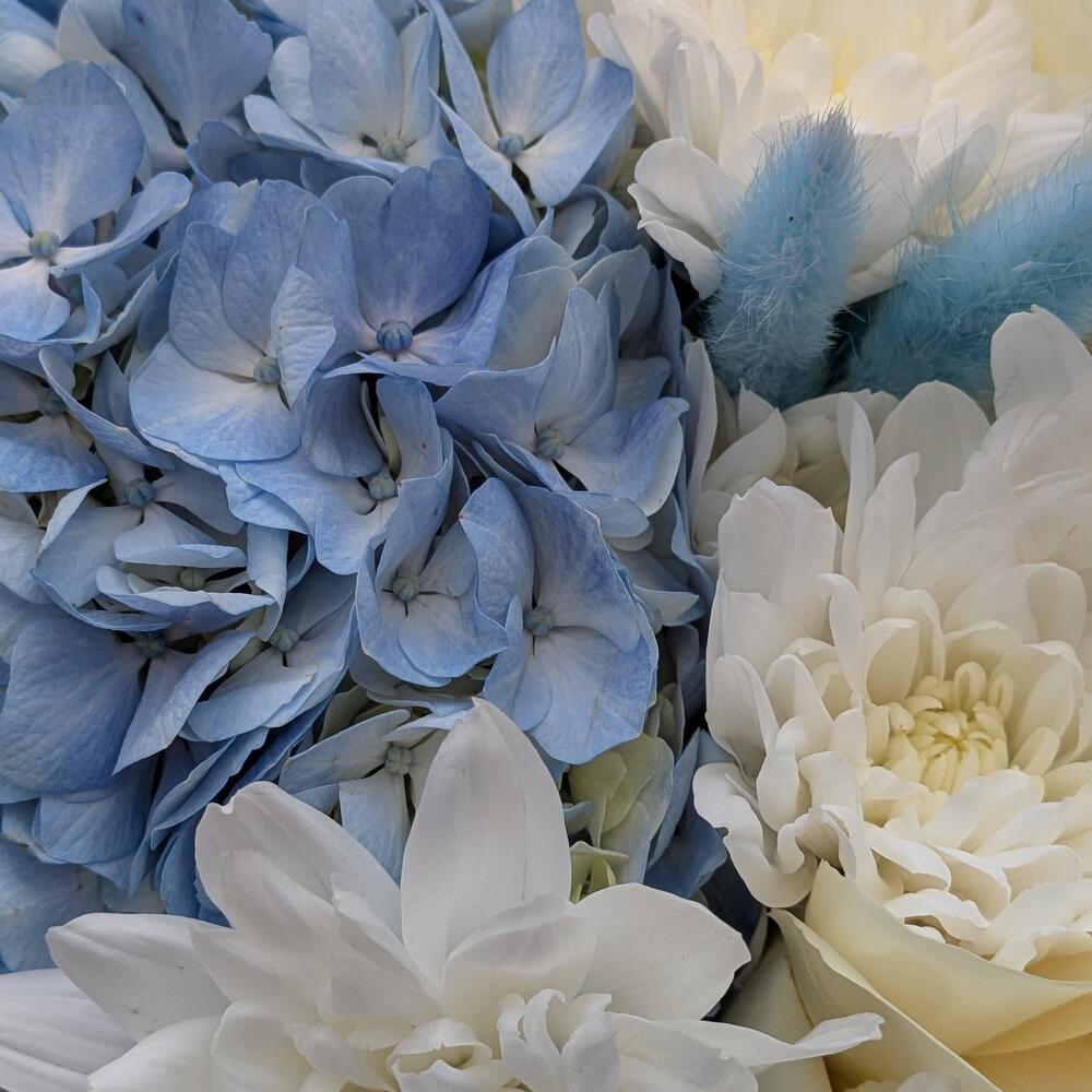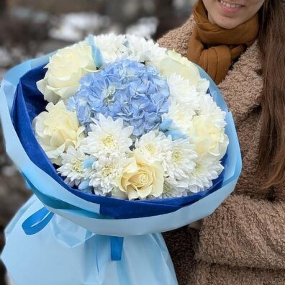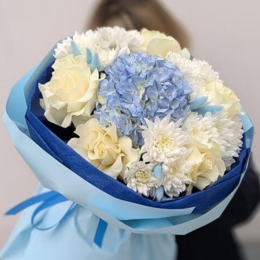 Букет с гортензией, розами, хризантемами "Синий коктейль" М