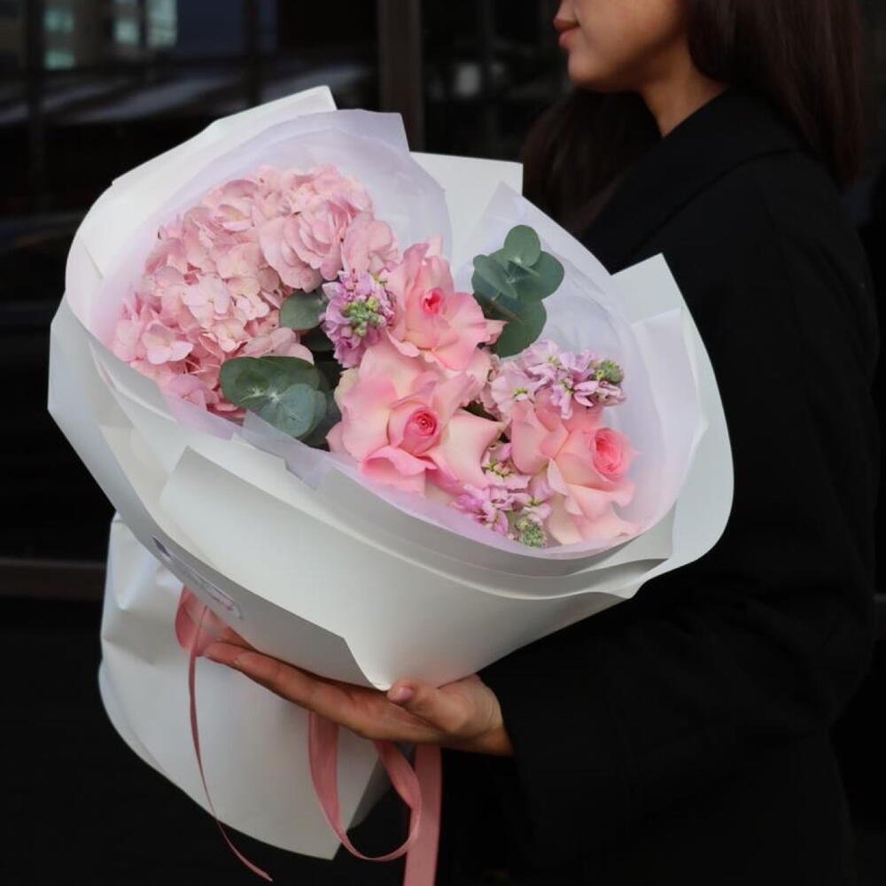 Гортензия - 1 шт. Маттиола - 3 шт. Эвкалипт - 2 шт. Роза - 3 шт.