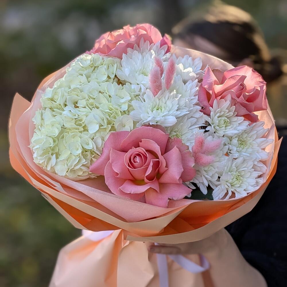 Гортензия - 1 шт. Хризантема кустовая - 2 шт. Лагурус - 6 шт. розы - 3 шт.