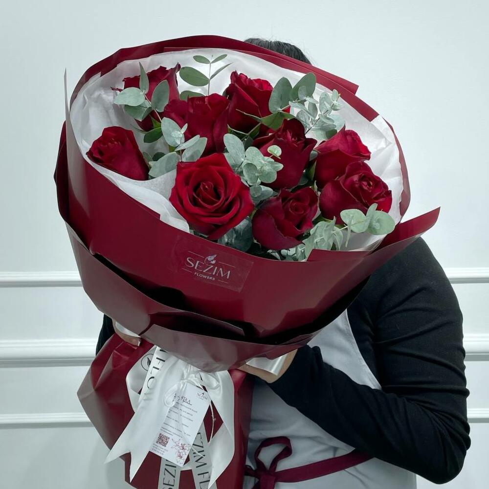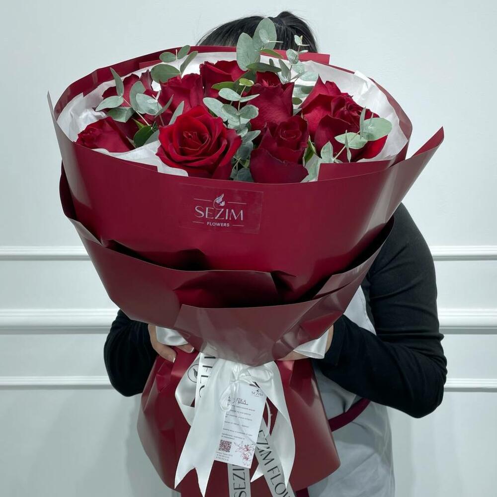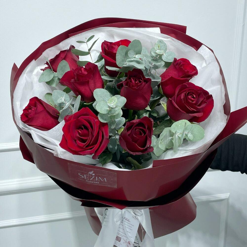 Букет с красными розами и эвкалиптом