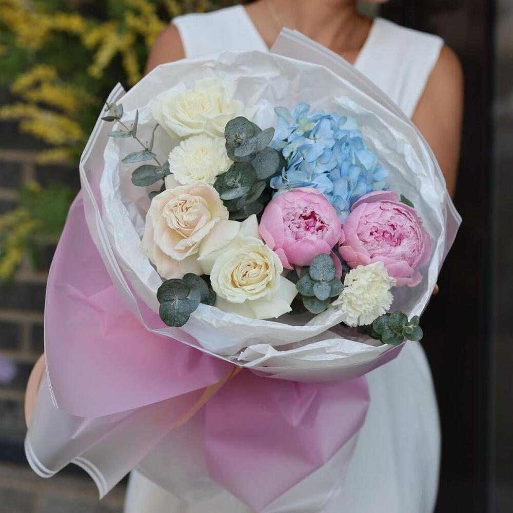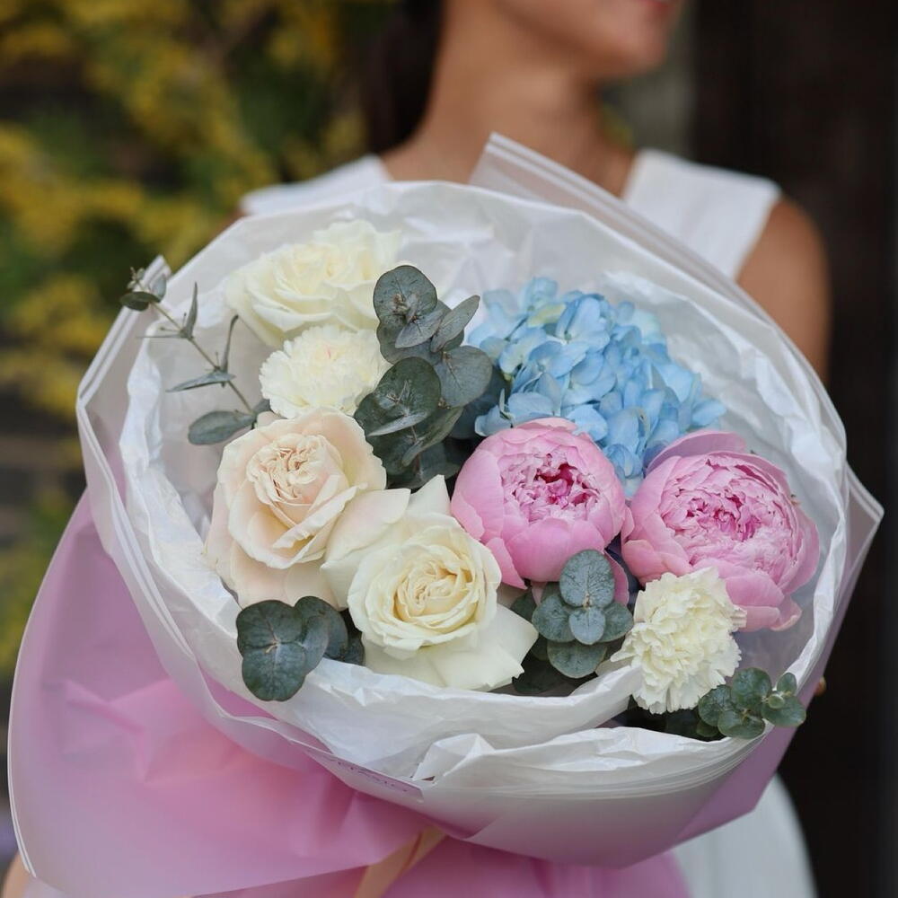 Гортензия - 1 шт. Эвкалипт - 5 шт. Роза - 3 шт. Диантус - 2 шт. Пион Сара Бернар - 2 шт.