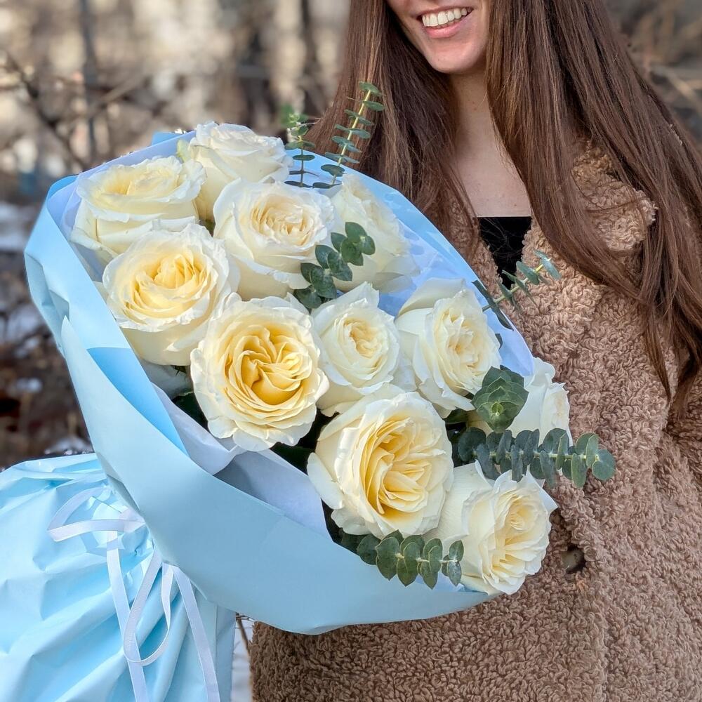 Букет из ароматной пионовидной розы Канделайт с эвкалиптом