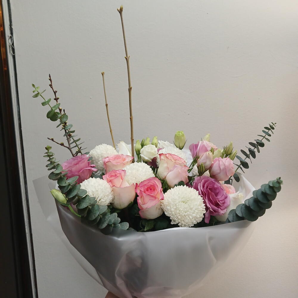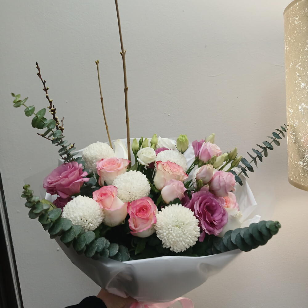 Эустома - 5 шт. Роза Джумилия - 5 шт. момоко - 7 шт. сирень ветка - 1 шт. абрикос ветка - 1 шт. Эвкалипт Бэби Блу - 4 шт.