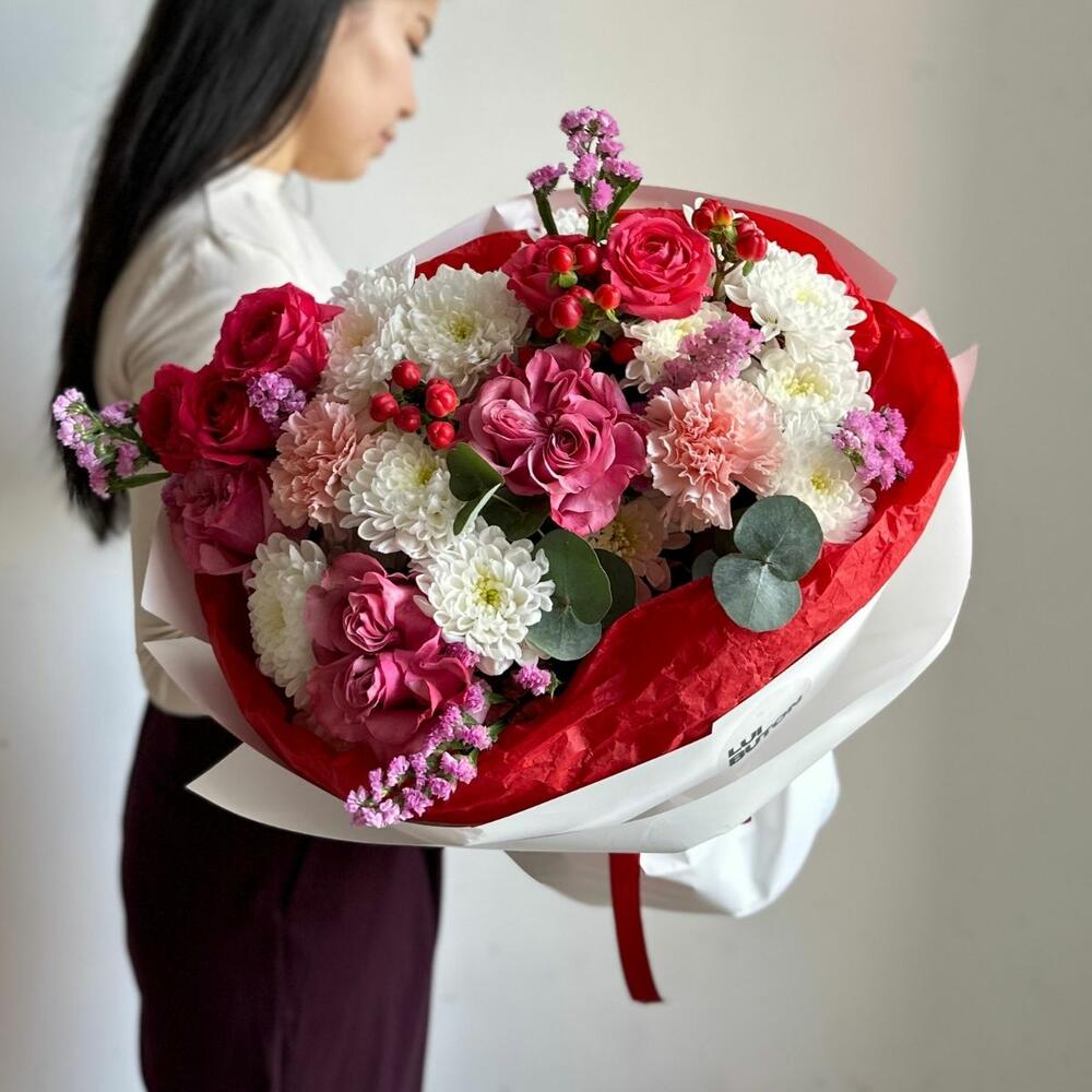 Гиперикум - 1 шт. Статица - 2 шт. Эвкалипт - 1 шт. Диантус - 3 шт. хризантемы - 3 шт. пионовидные розы - 3 шт. кустовые розы - 2 шт.