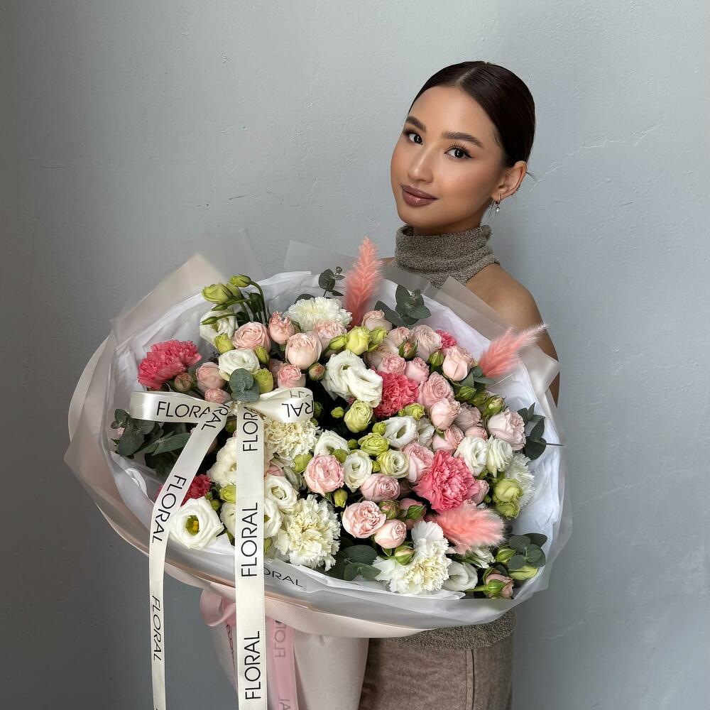 Лизиантус - 8 шт. Эвкалипт - 2 шт. Диантус - 11 шт. кустовые розы - 8 шт. сухоцвет пампас - 3 шт.