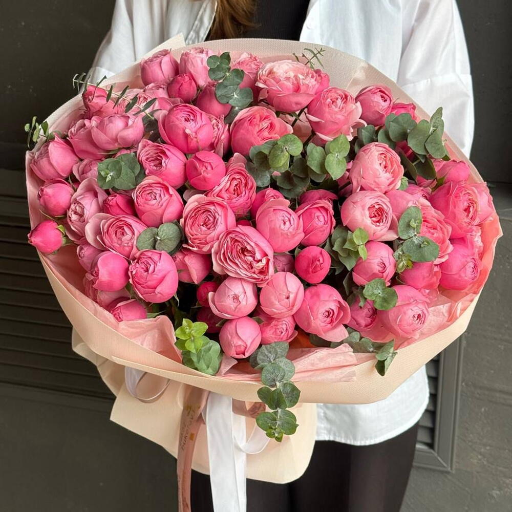 Букет «Сильва» — это нежность с характером. Пышные пионовидные спрей-розы в насыщенном розовом оттенке создают ощущение объёма и уюта, а свежий эвкалипт добавляет композиции лёгкости и благородного контраста. Букет выглядит живо, современно и очень трогательно — как искренний жест внимания без лишней помпезности.