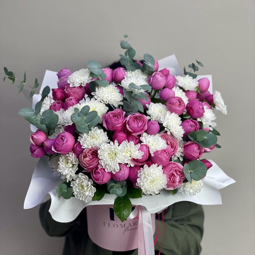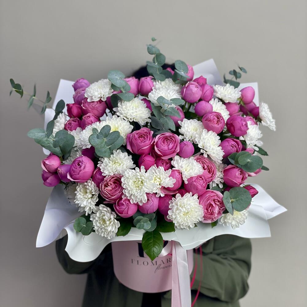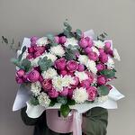 Букет «Сильва Пинк» в коробке — утонченное сочетание нежности Сильва Пинк, изысканных хризантем и освежающего эвкалипта. Этот композиция приносит волшебство пастельных оттенков, дополненное акцентами аромата и свежести, создавая умиротворенную атмосферу в каждой детали.