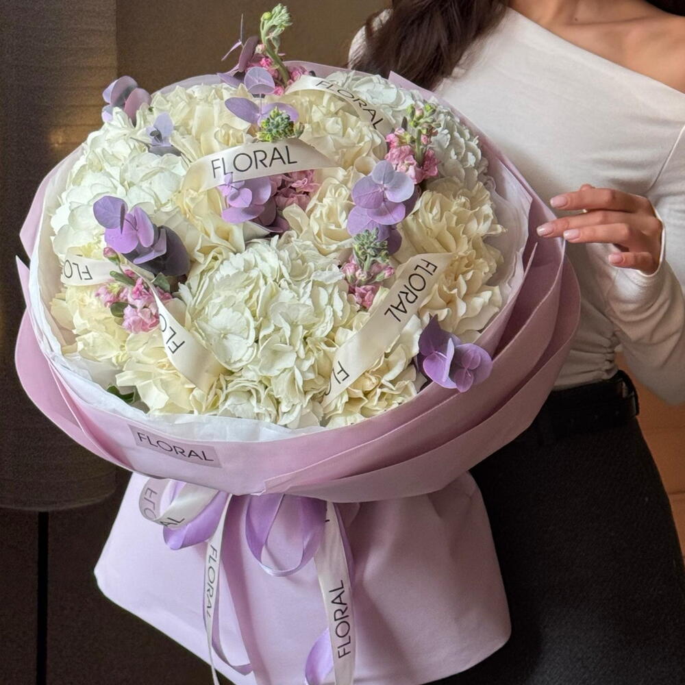 Гортензия - 3 шт. Маттиола - 5 шт. Эвкалипт - 1 шт. Роза - 13 шт.