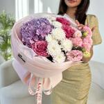 Букет из гортензии, эустом, пионовидных роз и хризантем в котором чувствуется гармония и доброта