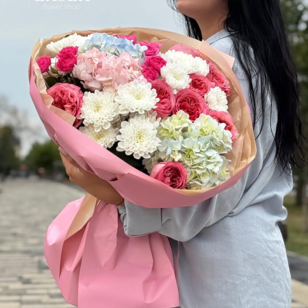 Гортензия - 3 шт. Хризантема кустовая - 4 шт. розы - 9 шт. кустовые розы - 3 шт.