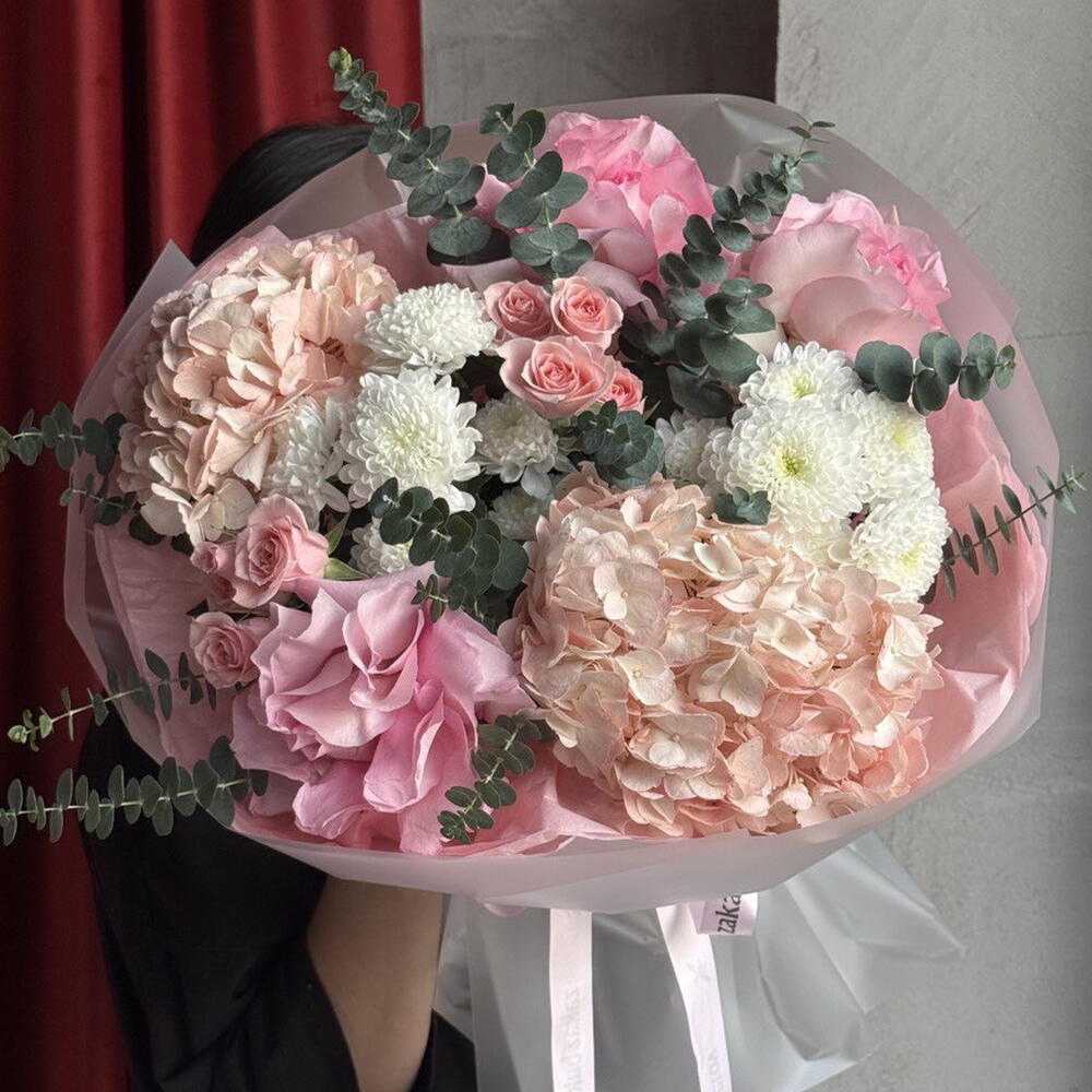 Гортензия - 2 шт. Хризантема кустовая - 2 шт. Эвкалипт - 1 шт. Роза - 3 шт. Спрей роза - 3 шт.
