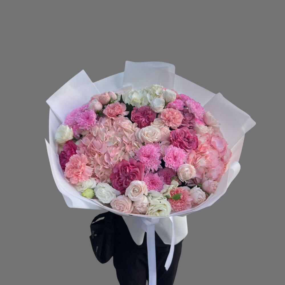 Гортензия - 3 шт. Роза - 5 шт. Кустовая роза - 7 шт. Кустовая хризантема - 3 шт. Эустома - 4 шт. Диантус - 4 шт. аква бумага - 1 шт.