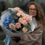 Авторский букет с голубой гортензией и пионовидными сортами роз