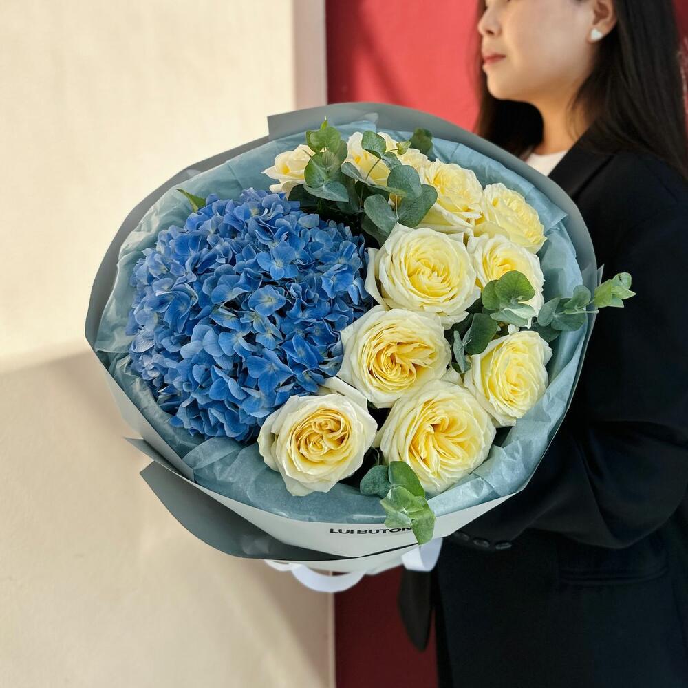Гортензия - 1 шт. Эвкалипт - 1 шт. пионовидные розы - 11 шт.