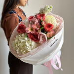 Альстромерия - 1 шт. Гортензия - 1 шт. Маттиола - 1 шт. Хризантема - 1 шт. Ранункулюс - 1 шт. Одноголовая хризантема - 1 шт. пионовидные розы - 5 шт.