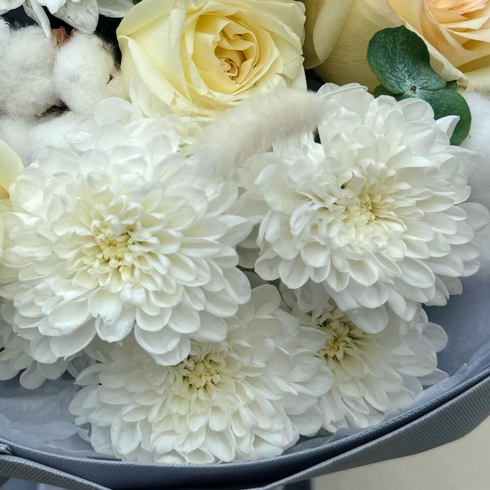 Хлопок - 3 шт. Эвкалипт - 5 шт. Хризантема - 3 шт. Сухоцветы - 3 шт. гортензии - 1 шт. розы - 5 шт.