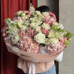 Гортензия - 9 шт. Лизиантус - 10 шт. Маттиола - 7 шт. Роза - 7 шт. Спрей роза - 10 шт. лилия пионовидная - 3 шт.