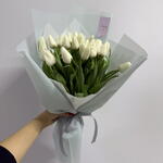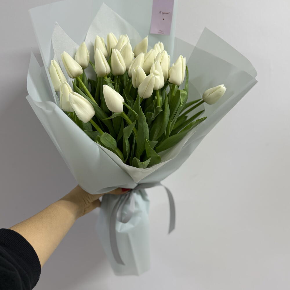 Букет тюльпаны белые в голубой упаковке М 25 Шт