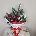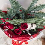 Ель нобилис - 3 шт. Лента атласная - 1 шт. Роза Freedom - 3 шт. Хлопок натуральный - 3 шт. Шишки натуральные - 2 шт. упаковка тишью и пленка - 4 шт. сухоцвет помпасная трава - 1 шт. эвкалипт "зомби" - 1 шт. украшения ягодки искусственные ветка - 2 шт.